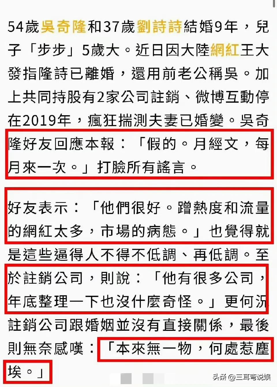 看到网上都坚信两人就是离婚了,吴奇隆的好友也忍不住出来回应了,称两人根本没有离婚,好的很。注销的公司也是正常的流程,吴奇隆有很多公司,只是整理一下而已。