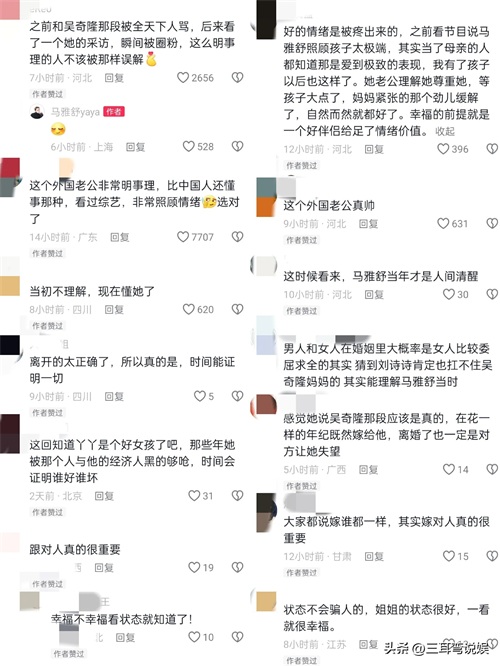 在下面的评论,马雅舒依然是把夸她当年人间清醒和夸她现任外国老公帅和明事理的都赞了一遍,说她后面是找到了对的人。
