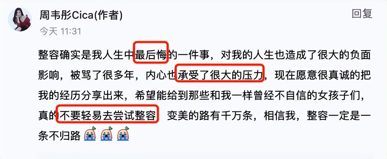 而且她的个人账号评论区也表示整容的确是人生当中最后悔的一件事,对自己的人生也造成了很大的负面影响,内心承受了很大的压力,并告诉众多的网友,粉丝真的不要轻易去尝试整容。