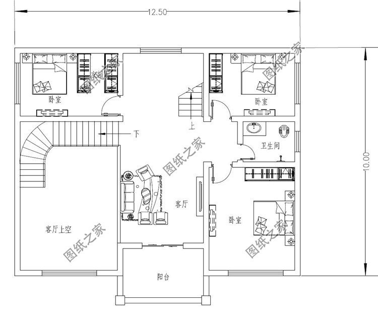 二层户型:客厅挑空、客厅、卧室(带衣帽间)、卧室x2、卫生间、阳台;