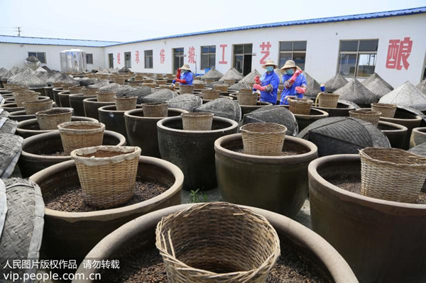 2025年6月13日,曲坊园酿造厂工人在甜闷瓜缸里吸抽酱油,保证其均匀发酵。(邵世新 王维聪/人民图片)