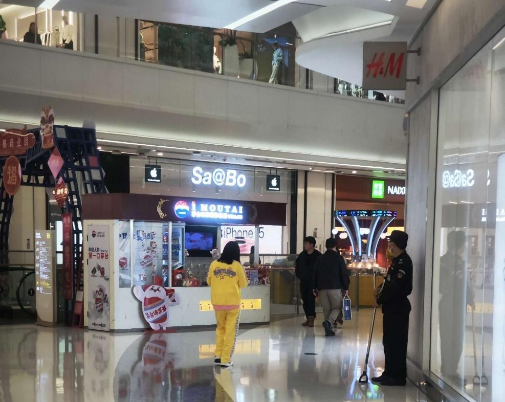 (商场内部手持钢叉的保安人员)