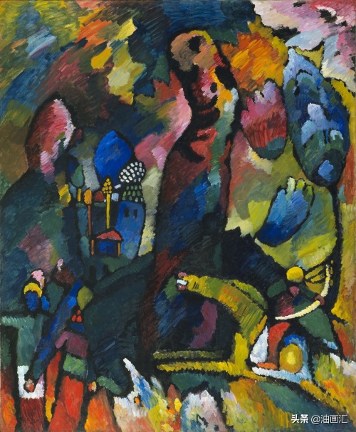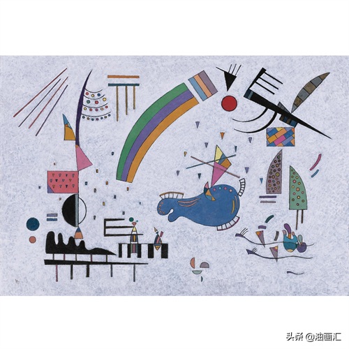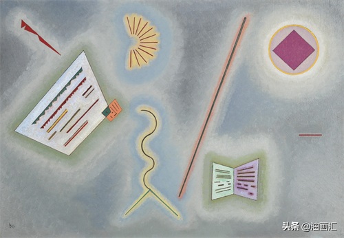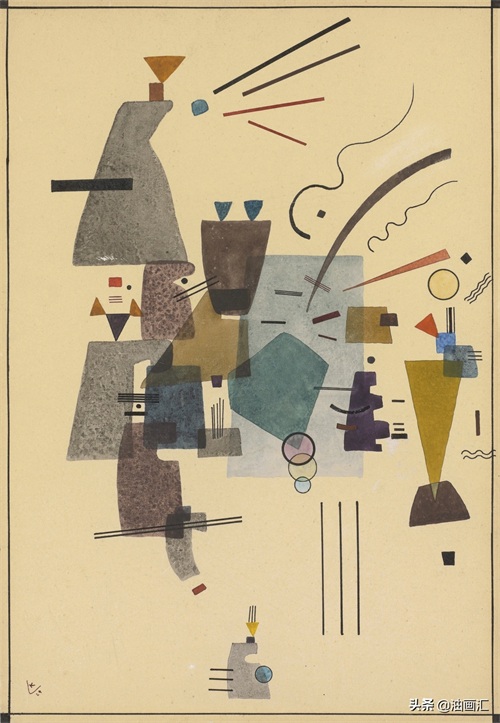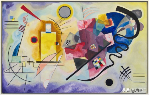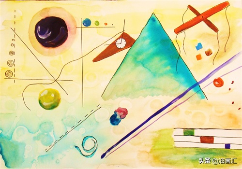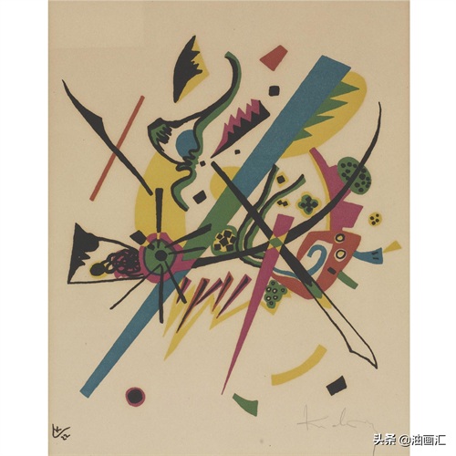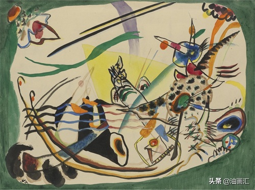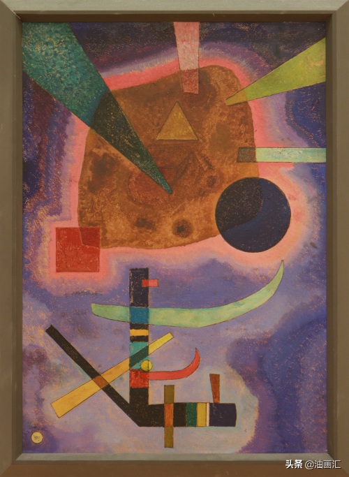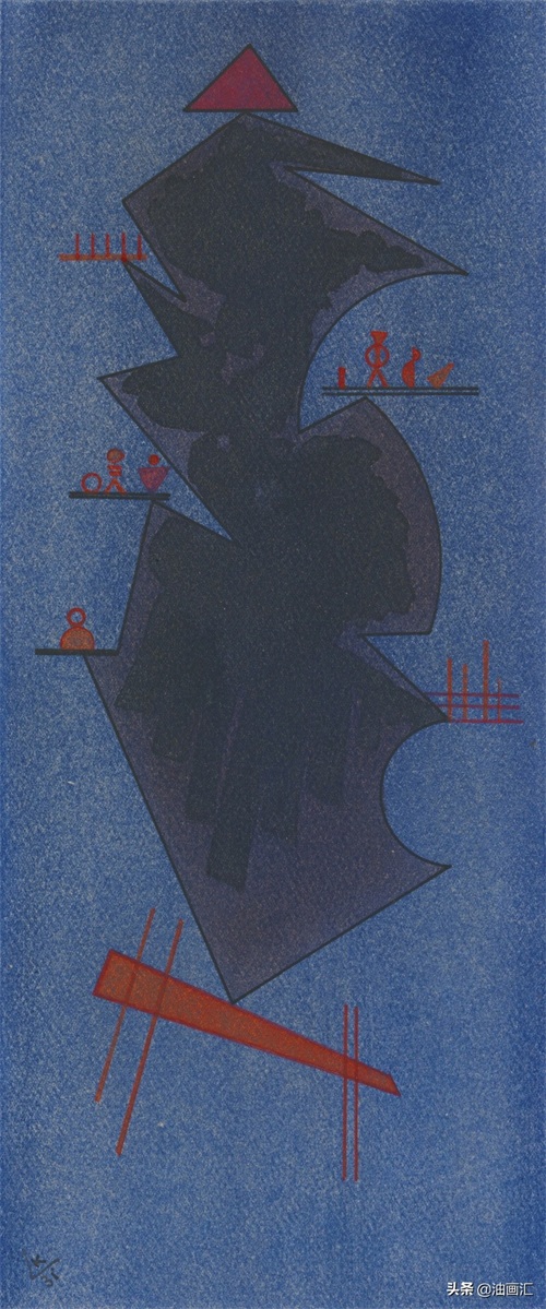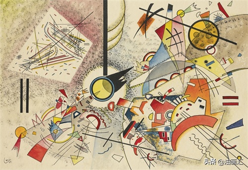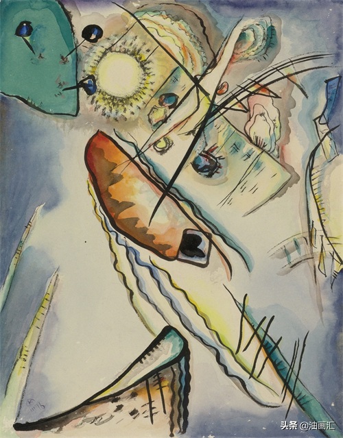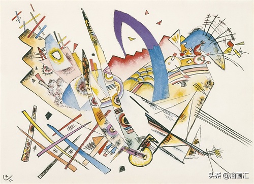 康定斯基的画作对于我们一般人来说太深奥了,对于我们这些初级欣赏者来说简直不要太狂野。他的色彩、线条、符号,如此错乱的纠缠和奔腾在画面上,这到底是要表达什么样的内涵,因为康定斯基年轻时学过钢琴,还是个的大提琴手,他写过一些美术理论,主要是讲点线面与色彩的构成模式。“抽象画对他来说,也是另一种抒发心灵语言的方式。”