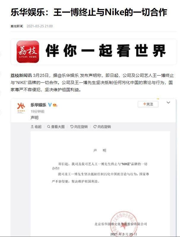除此之外,跟耐克有过合作的王一博谭松韵等明星也在微博上晒出自己和耐克终止合作的条约。