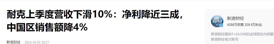 新浪财经——耐克上季度营收下滑10%:净利降近三成,中国区销售额降4%