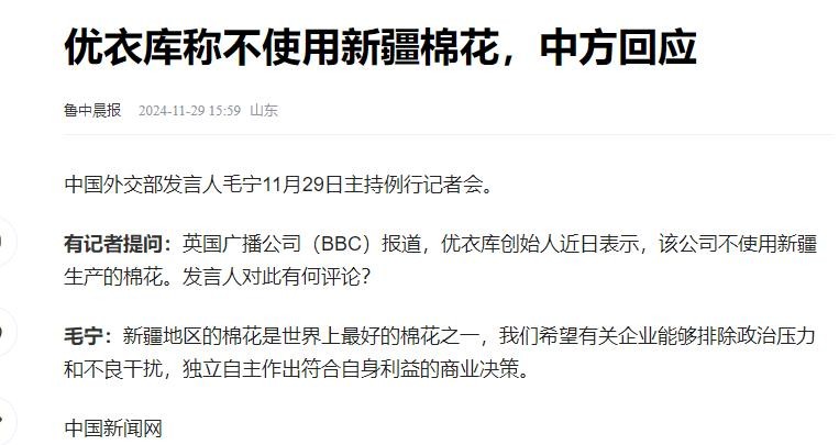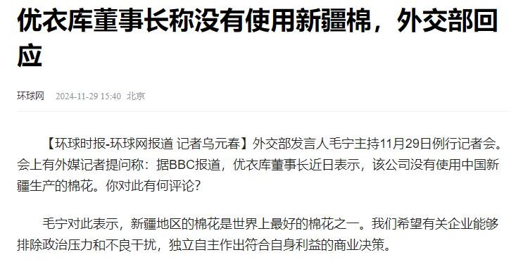 环球网——优衣库董事长称没有使用新疆棉,外交部回应