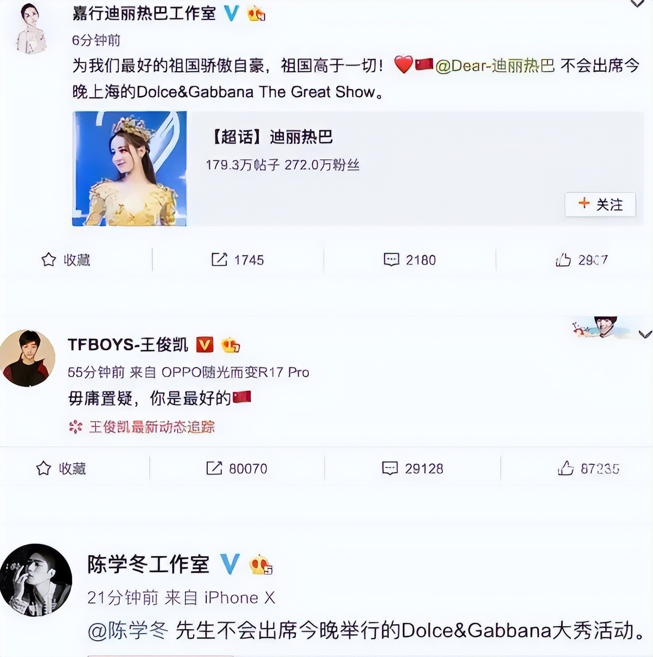 不仅如此,就连要参加杜嘉班纳线下走秀活动的众多明星,也发布声明表示取消行程,力挺中国。