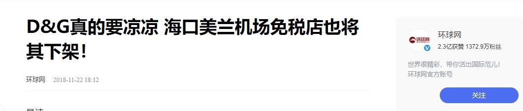 环球网——D&G真的要凉凉 海口美兰机场免税店也将其下架!