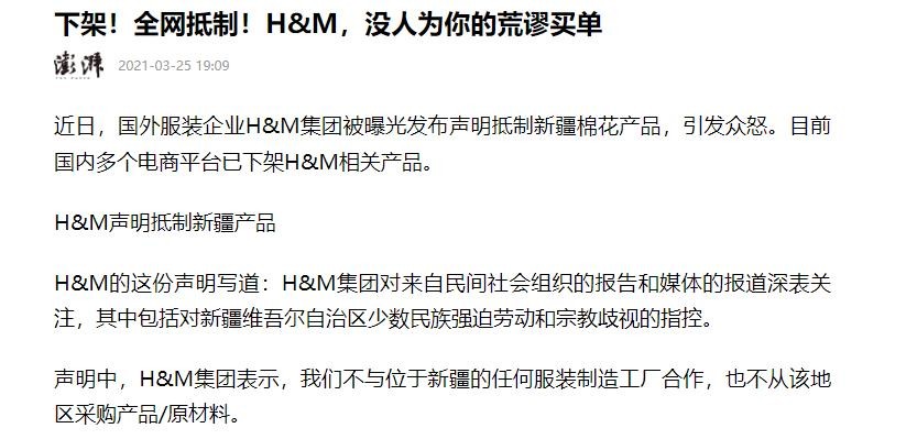 澎湃新闻——下架!全网抵制!H&M,没人为你的荒谬买单