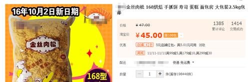 其中销量颇高的一款“金丝肉松”的卖家称,这种“肉松”5斤售价仅45元,可供烘焙、制作手抓饼、寿司和蛋糕等使用。
