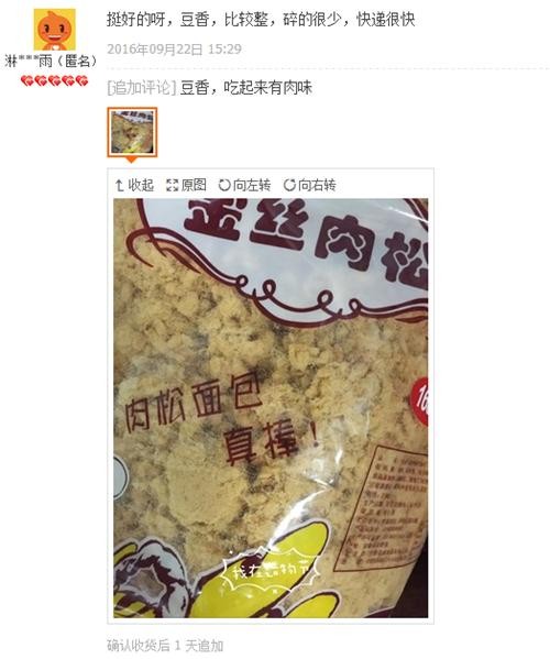 卖家坦言,这款“肉松”中的(豌豆)粉比较多。买家的好评更是让我哭笑不得…“挺好的呀,豆香,吃起来有肉味!”