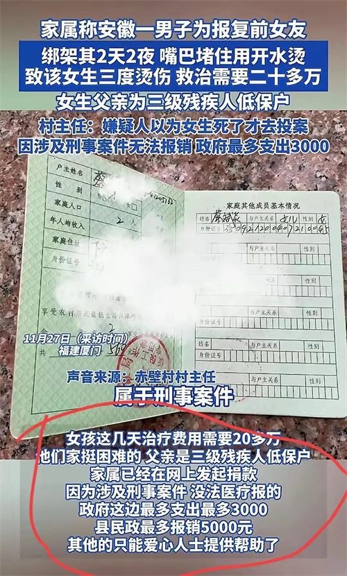 女孩目前躺在病床上,面容憔悴,急需治疗。然而,治疗费用高达25至30万元,这对于一个本就困难的家庭来说无疑是巨大的负担。女孩的父亲三级残疾,靠吃低保维持生活,根本无法承担这笔费用。而前男友来自单亲家庭,其亲爸和后妈均不愿承担赔偿责任,这使得女孩的治疗费用问题更加棘手。