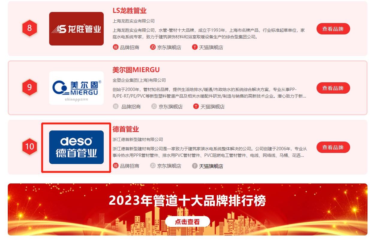 浙江德首新型建材有限公司是一家致力于建筑家装水电系统整体解决的公司。公司创建于2006年,专业从事冷热水用PPR管材管件、排水用PVC管材管件、PVC阻燃电工管材管件、电线、网络线、马桶、花洒、龙头、净水器等产品的研发、生产、销售和服务。公司创建以来,一直坚持诚信经营,获得社会和广大顾客的认同,先后取得“国家高新技术企业”、“中国管业十大品牌”、“浙江省科技企业”、“中国著名品牌”、进出口“A类管理企业”、“外贸出口先进单位”、“明星企业”、“信用AAA企业”等荣誉;