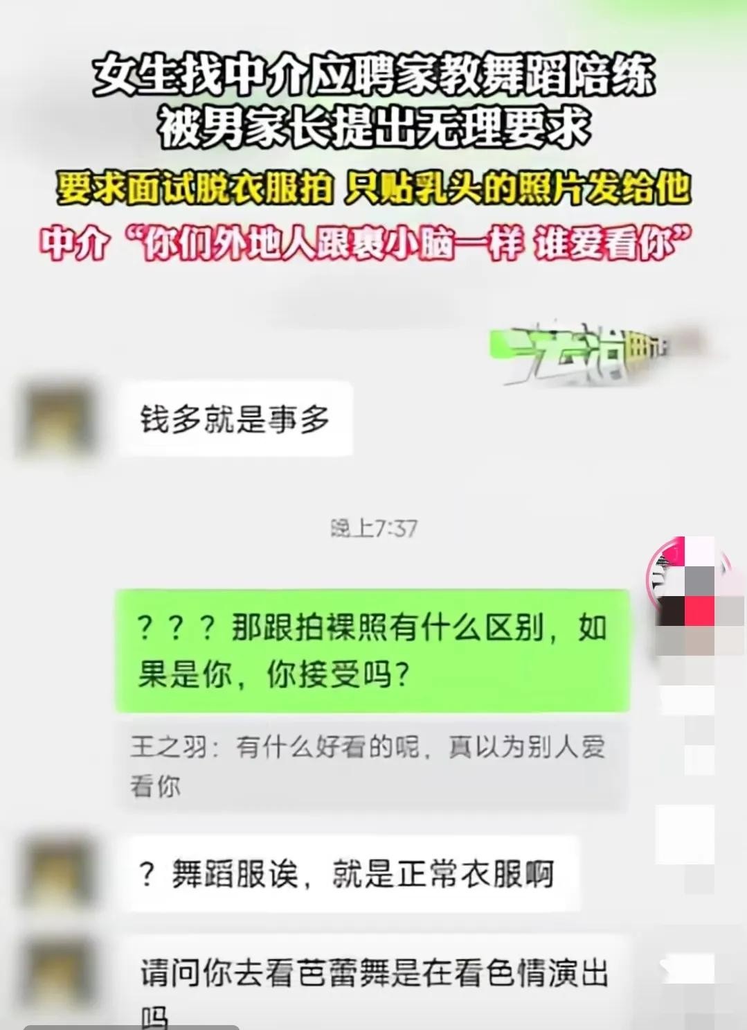 男家长在微信上要求女孩脱掉舞蹈服,然后穿贴住乳头的衣服拍照,还要拍特写,这些要求根本就是在挑战人类的道德底线!