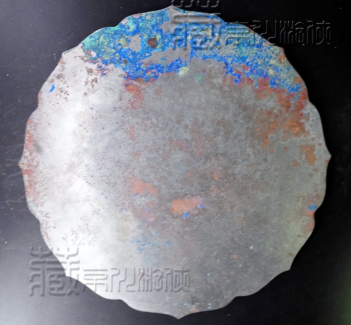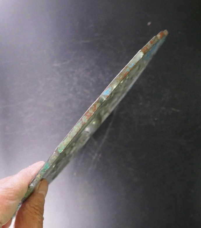 再察锈相。可见镜背大部分无锈,银色凸显,是为含锡量较高的青铜银背铜镜质色。镜背和镜面均有孔雀蓝和铁锈红锈痂附着,其中镜面锈痂面积稍大,察其锈质,生硬不糟,附着紧实,可抗刃击。其虽为银背,然其色质温润,光泽亮而不贼,更无火气。其锈痂分布自然,非新伪人为可得。无需再表,辩锈识浆,此镜锈相亦是开门无疑矣。