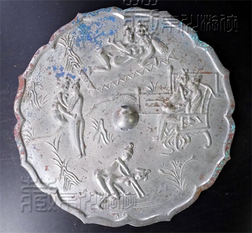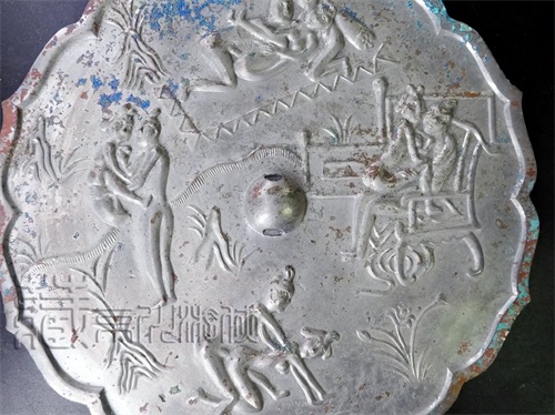 首赏纹相。本品镜式为花边形,直径约为25.5厘米,重约1.45千克。镜体厚薄适中。续可见其镜背纹饰为四幅男女交媾的图纹,环境纹饰分别有卧榻、花园、书房、室外的象征。其人物形态鲜明,生动逼真。其中,从男女人物的发髻头饰上,可见鲜明的唐代风格,配合花边镜式,可以确定其唐镜,开门无疑。