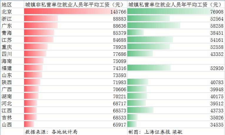 紧随其后的是浙江、广东、青海、江苏,这些地方城镇非私营单位就业人员平均工资都超过8万元。
