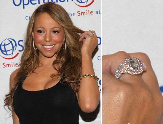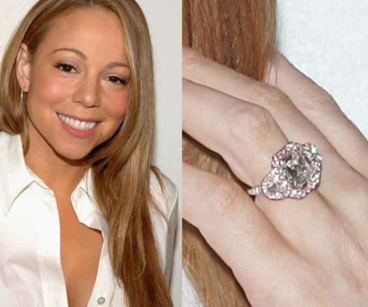 这枚戒指是有一定意义的,它是玛丽亚·凯莉和尼克·卡农的定情信物,在二人的订婚典礼上,丈夫将这枚为她量身定制的钻戒赠予了她。这是一款制作非常精细的戒指,铂金质地的外环很有光泽,佩戴起来显得手指也十分纤细,戒指表面镶嵌的这颗钻石是非常耀眼的。