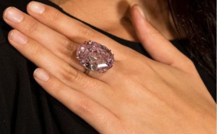 这枚戒指在4月份的时候出现在了香港苏富比的一次拍卖会上,当时的拍卖价可以达到5.5亿港币,是非常惊人的数字,创新了拍卖界钻石等的新纪录。这枚戒指的重量可以达到59.60克拉,佩戴在手指有一定的分量。后来著名的珠宝品牌周大福珍藏。这枚戒指的外环是由铂金打造而成,因此外观十分闪亮,表面镶嵌的是一颗很闪耀的粉红色钻石。这颗钻石有着超高的切割工艺,质地也非常清透,整体造型非常高贵,和它的拍卖价也很符合。