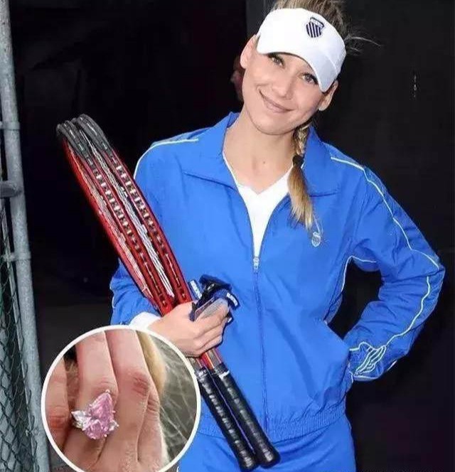这枚戒指是来自职业网球选手安娜·库尔尼科娃,她很喜欢这枚戒指,因此佩戴它的频率也是极高的。这枚戒指的铂金外环表面还镶嵌了很多圆形的小钻石,光从外形看就很吸引人了。戒指表面镶嵌这颗钻石更加有光芒,它的外观是梨形款式,它的外形还设计了一定的弧度感,使得戒指的表面积比较庞大,它的重量有11克拉,戴在指尖显得很有活力。这枚戒指也是她经常会戴在赛场上的首饰,市场价达到600万美元,可以说非常珍贵了。