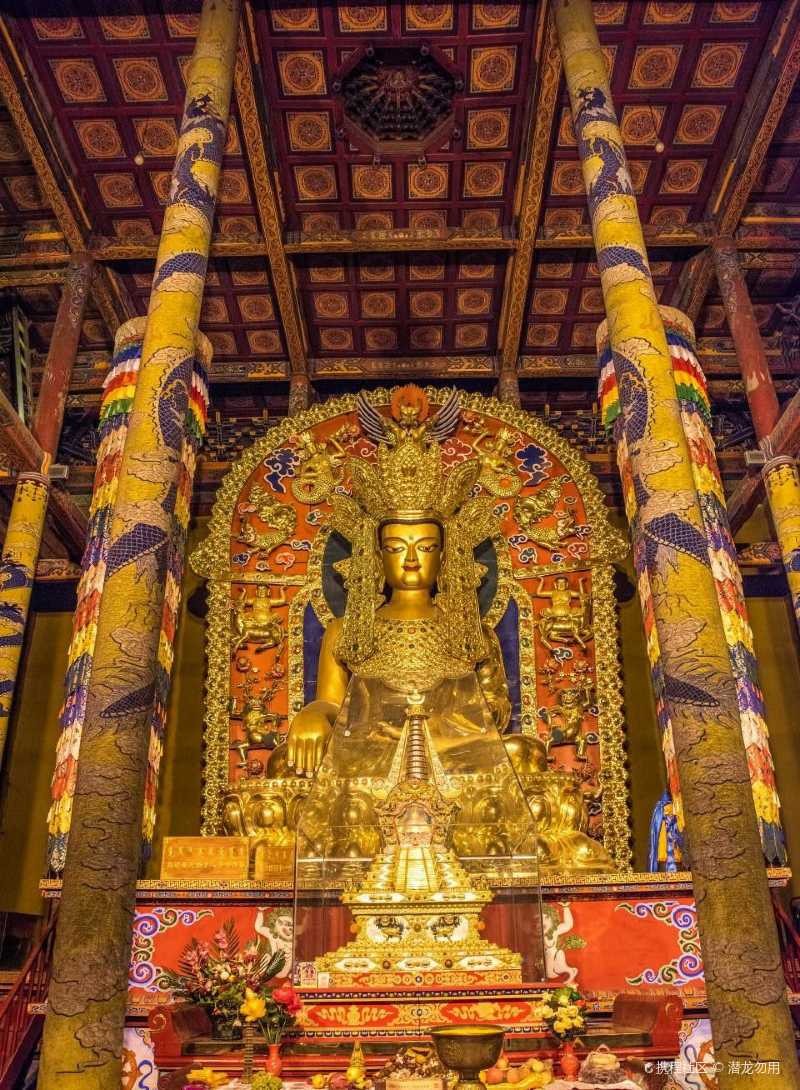 寺内建筑五进,中轴线上有牌楼、山门、过殿、大经堂、佛殿。大经堂采用藏汉结合式结构,四壁用彩色琉璃砖包镶,脊上有鎏金宝刹、相轮、飞龙和瑞鹿等装饰。清朝康熙帝御制“平定噶尔丹纪功碑”立于大殿前。寺内还有白石雕砌覆钵式喇嘛塔,高15米,颇为壮观。