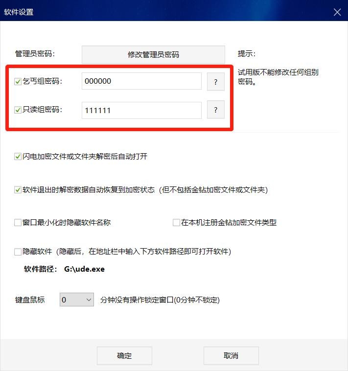 同时,U盘超级加密3000还支持只读加密,只需在“软件设置”中勾选“只读组密码”,设置后点击“确定”即可。使用只读组密码登录软件后,闪电加密区的数据只能查看,不能进行编辑、复制、删除等操作。