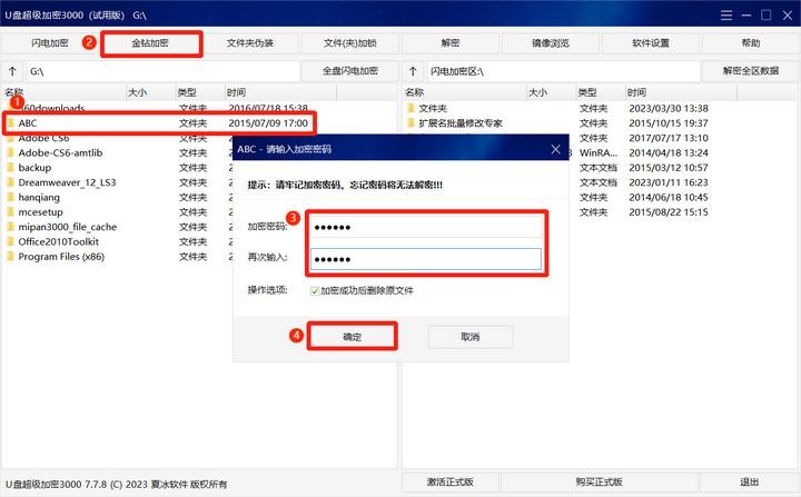 U盘超级加密3000提供了两种加密方式,分别是闪电加密和金钻加密:
