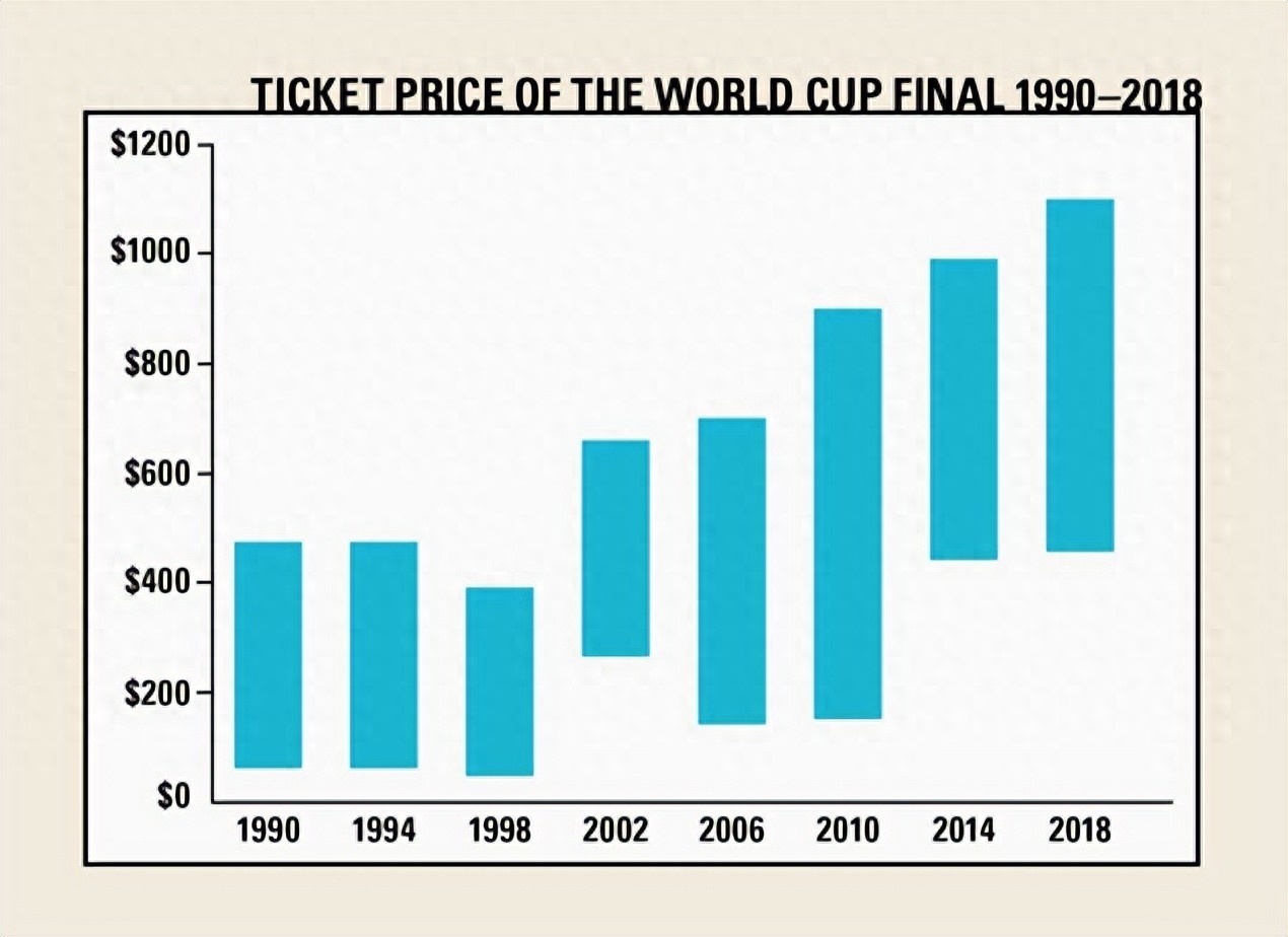 分析2022年世界杯决赛门票单价前,我们可以参考一下以往的决赛门票价格走势。