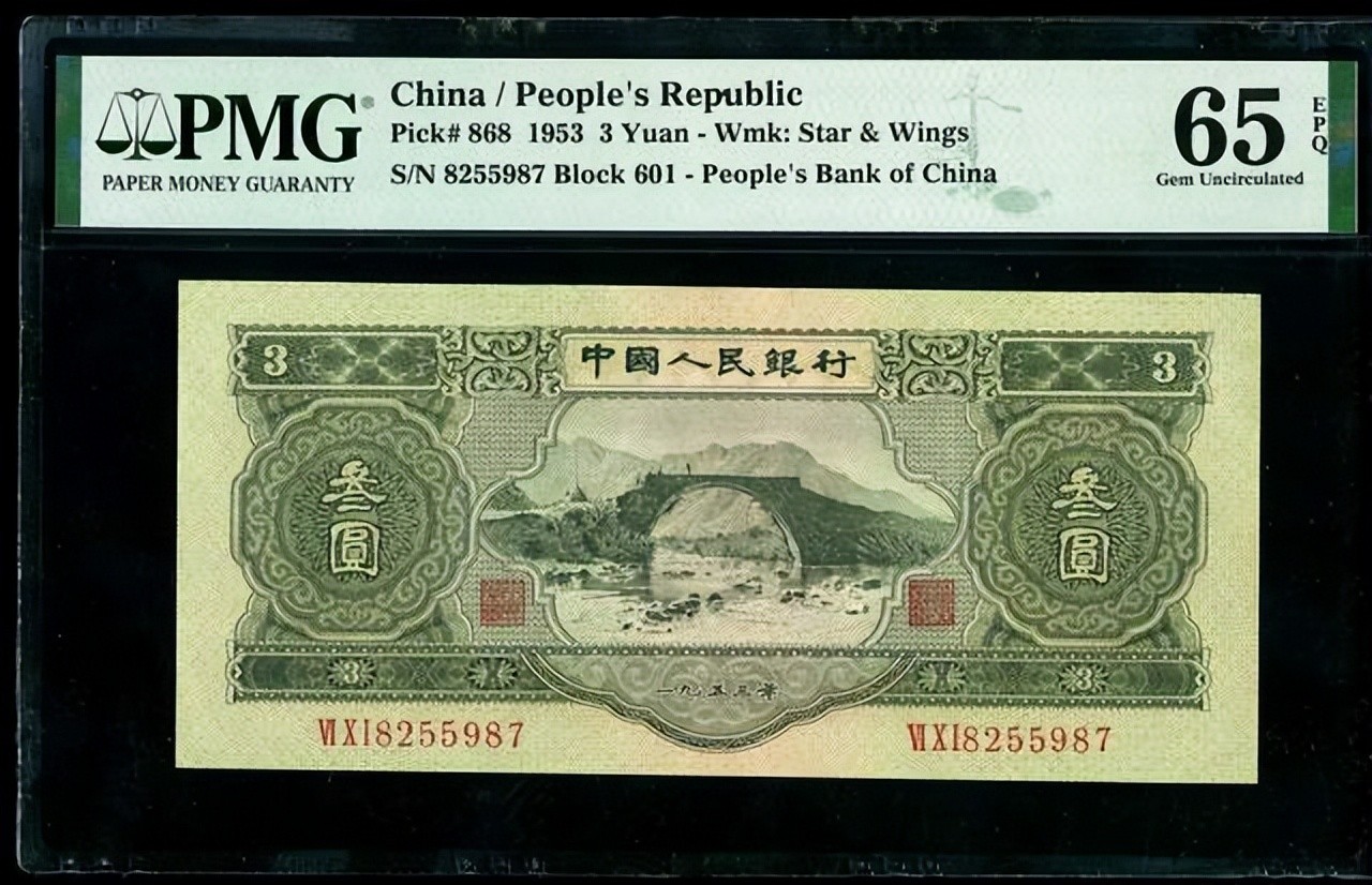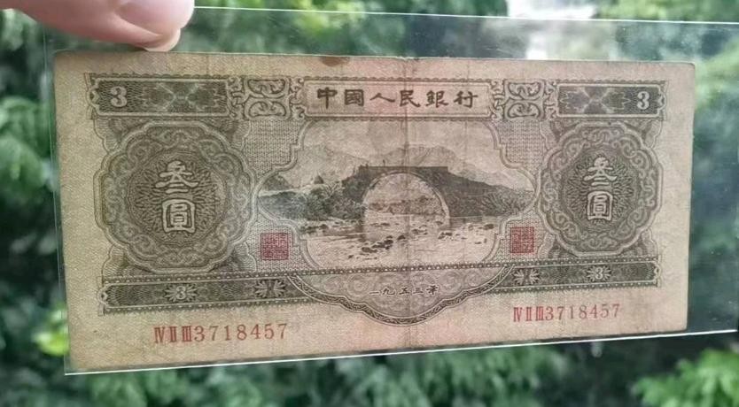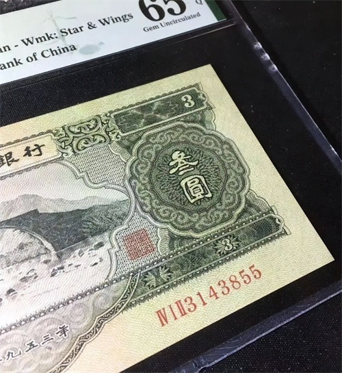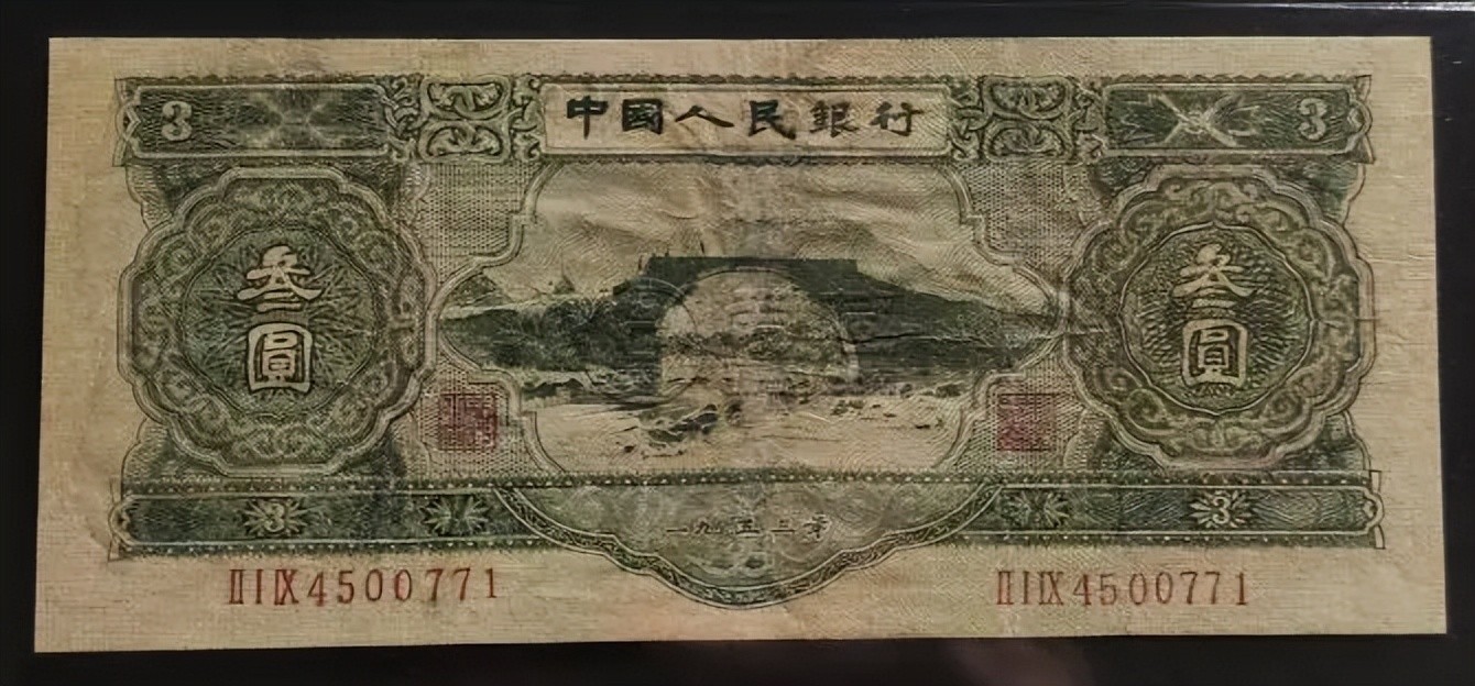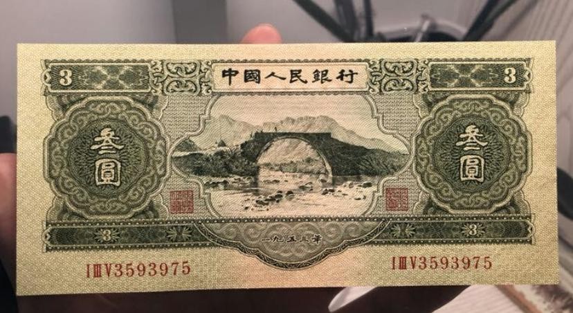 本期我们重点聊“苏三币”中的绿3元,这张绿3元人民币票面图案设计活泼大方,整体为淡绿色,长16厘米,宽7.2厘米,比2013年流通的1元人民币纸币票面稍微大一些,正面的两端各有繁体三元字样,下面标着“1953年”,其正面花边为深绿色,底纹中间为橙色,两边为浅橄榄绿色;正上方为马文蔚书写的“中国人民银行”六字,纸币中央为井冈山龙源口石桥图景,其两端花符内各有繁体“三元”两字。