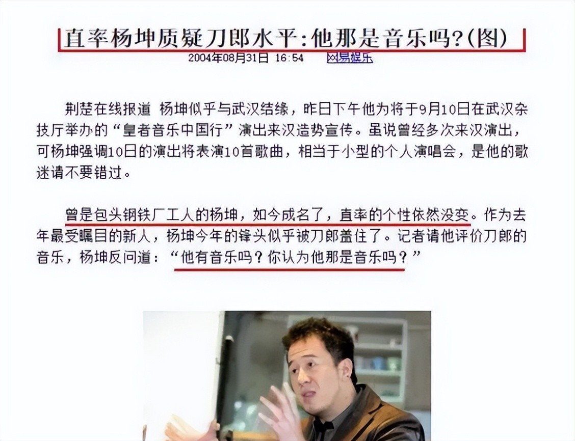 杨坤评价刀郎的歌配不上他的地位,甚至他的歌都不能称为歌曲,完全是在消费听众心中的情怀,