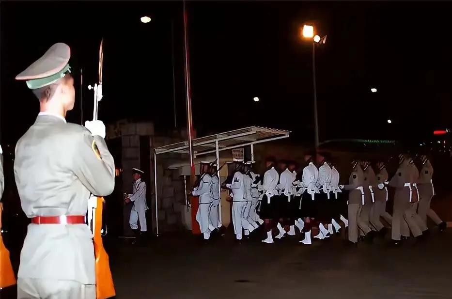 与此同时,驻港部队护旗队员高举国旗迈着正步走向旗杆,1997年7月1日零时零分,威尔士亲王军营升起了中华人民共和国的国旗-五星红旗。