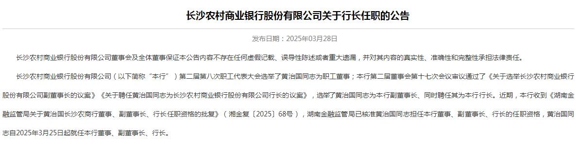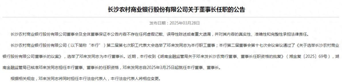 4月7日,潇湘晨报·辣椒财经记者注意到,长沙农商银行日前公告了董事长、行长的最新任职情况。经该行会议选举,邓来发为董事长,黄治国为副董事长、行长,近期两人的任职资格均已获湖南金融监管局核准,自2025年3月25日起就任。