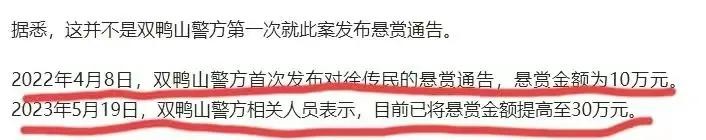 2022年4月8号,首次发布对徐传民的悬赏通告,悬赏金额10万元;2023年5月19日,悬赏金额提高到30万,值得昨天,悬赏金额已高达50万!