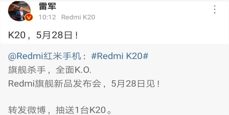 雷军表示,红米Redmi旗舰新品发布会将于5月28日(下周二)召开,届时将公布新机K20系列的售价与全部配置。