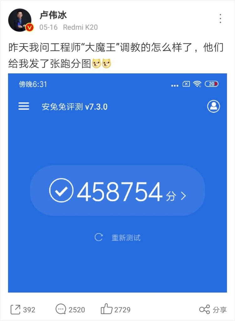 在性能方面,K20系列(红米K20 Pro)的安兔兔跑分达458754分,而此前的小米9跑分为371838分, 红米K20 Pro竟比小米9高8万分。