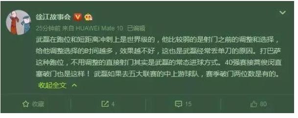 赛后,在最终的冲刺时速统计中,武磊全场第一,时速高达32.1公里每小时,力压梅西;而梅西的时速是31.4 公里每小时,比武磊少0.7公里每小时。