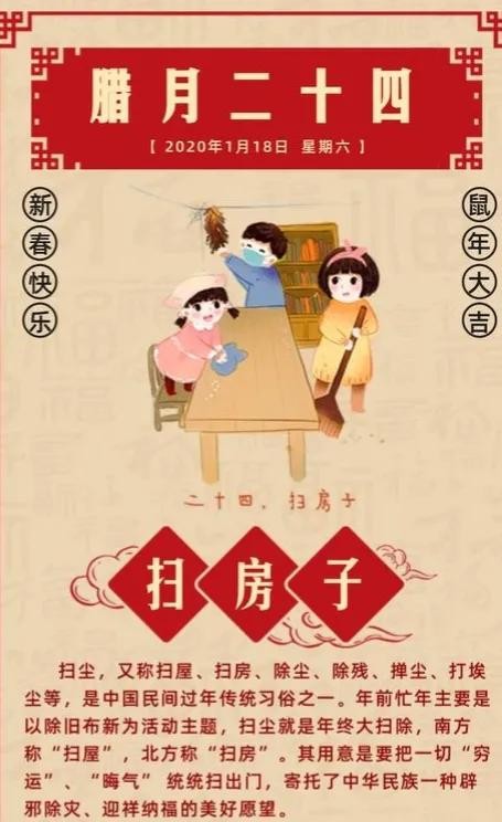 总之,腊月二十四这一传统的“扫尘日”习俗体现了人们对新年的期盼和向往。在现代社会,人们可以灵活运用时间进行家庭清洁,并注重家庭成员之间的合作和分享。让我们珍视传统习俗所蕴含的价值,以一种符合现代生活方式的方式传承和发扬,为新年带来幸福和美好。