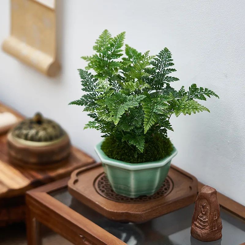 狼尾蕨造型飘逸别致,观赏价值极高,是一种非常理想家庭盆栽植物品种。常常被用于制作小盆景放置于桌面、书房、茶几等处观赏,或者将它作为其他花草的配角,用于搭配雨林缸或植物墙。