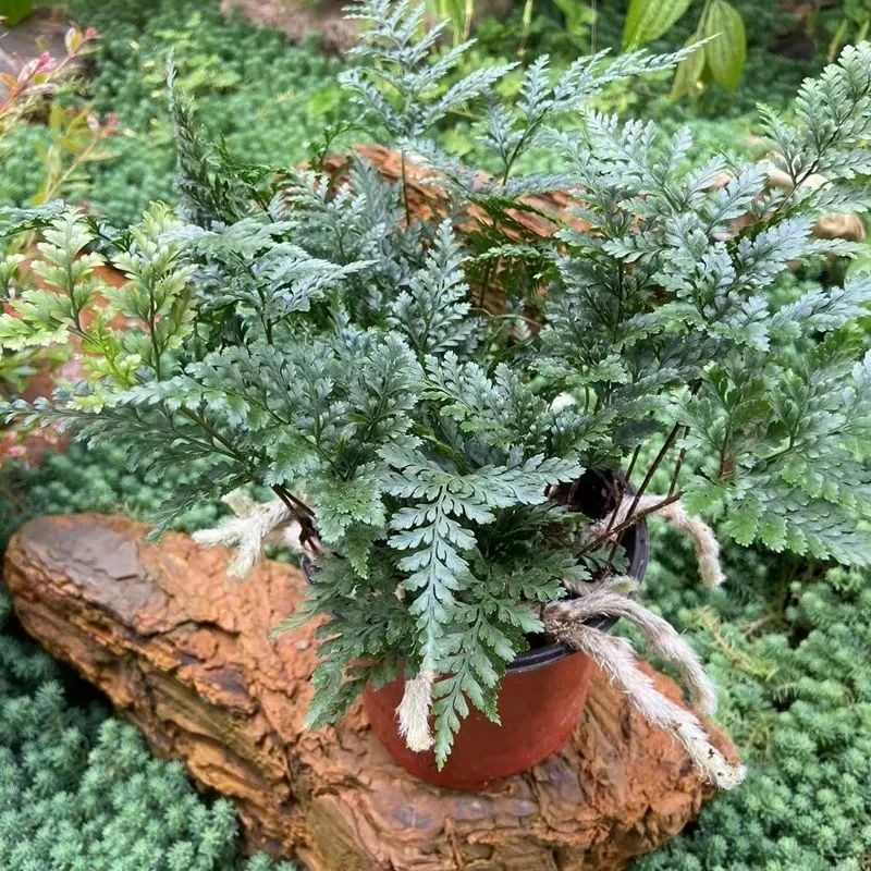 狼尾蕨株型矮小且生长缓慢,叶片如同羽毛状,小叶呈细致的椭圆形或者羽裂状叶,表面光滑,四季浓绿并带有光泽感。羽毛状叶片由纤细的叶柄支撑,株型看上去与文竹有些相似。