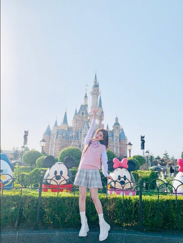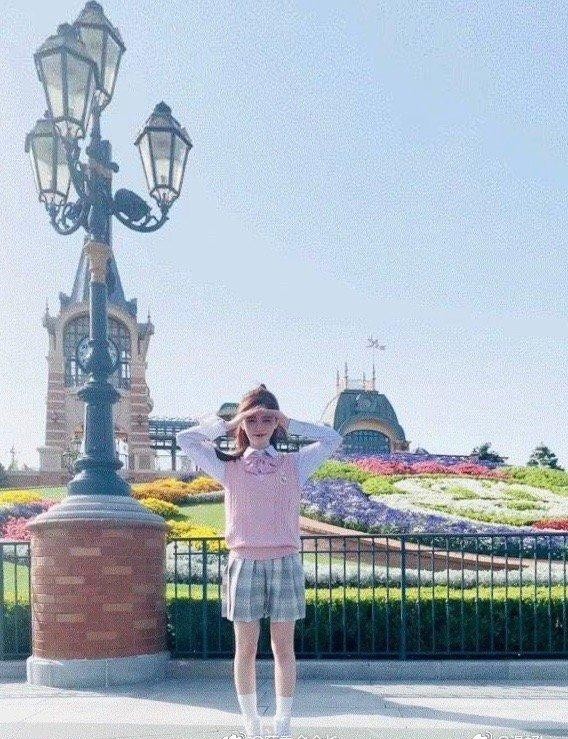 再看微博自发图,这简直就是肤白貌美大长腿啊。挑不出任何毛病,这身高至少165厘米。然而我们再来看她在迪士尼玩的未修图 。