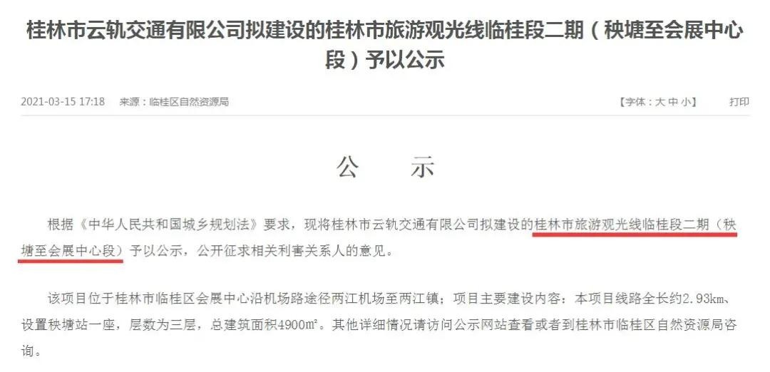 2021年3月15日,临桂区自然资源局将《桂林市云轨交通有限公司拟建设的桂林市旅游观光线临桂段二期(秧塘至会展中心段)总平面图》予以公示。