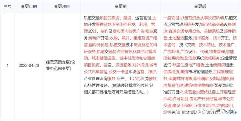 也就是说,轨道交通项目的投资、建设、运营管理,轨道交通特许经营权及其他经营活动不再为其经营范围。
