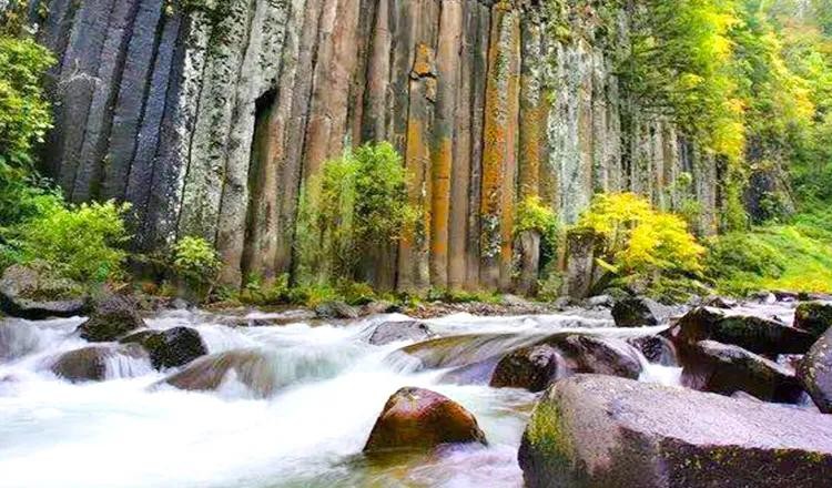 望天鹅山是一个巨大的破火山口,沟内因破火山作用形成的火山地质遗迹跟景观都非常奇特。有的像千手观音,有的像巨大的书库,整齐排列着一卷卷书,有的像能够登天的阶梯,有的像旋转起来的黑白万花筒。
