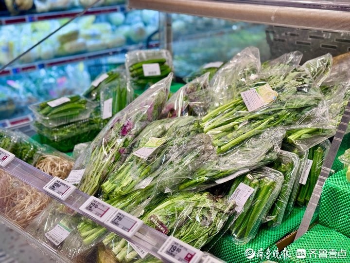 24日下午,记者来到济南印象城盒马鲜生,发现板蓝根青菜被摆放在春菜品类的显眼位置,经过了初步清理,用透明塑料袋包装,每份300克,售价为12.9元,折合21.5元/斤,标注产地为云南。