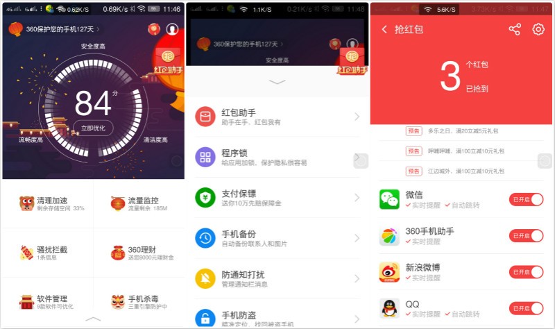 360安全卫士的红包助手。360公司于1月22日晚推出了抢红包版360安全卫士,该版本同样支持微信、QQ、支付宝等红包的提醒。