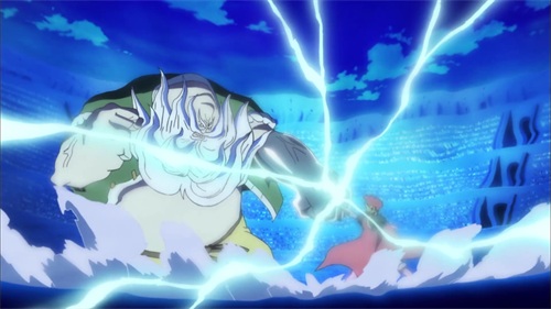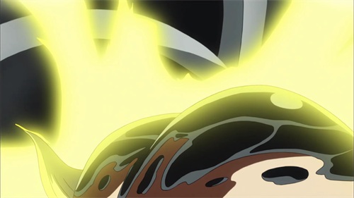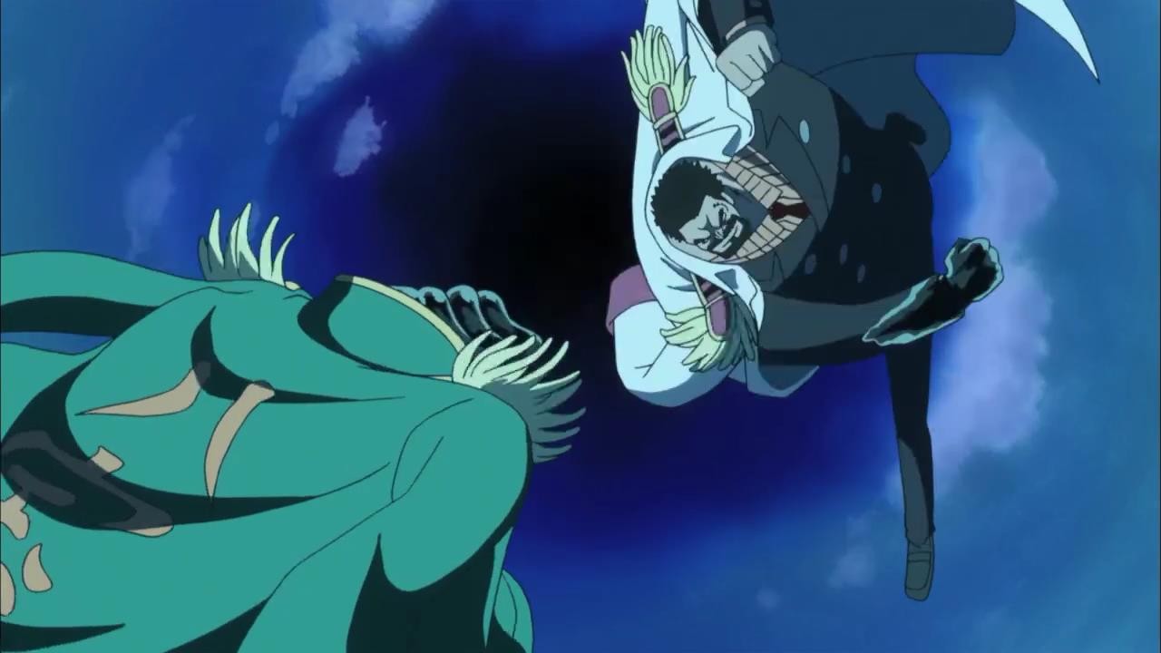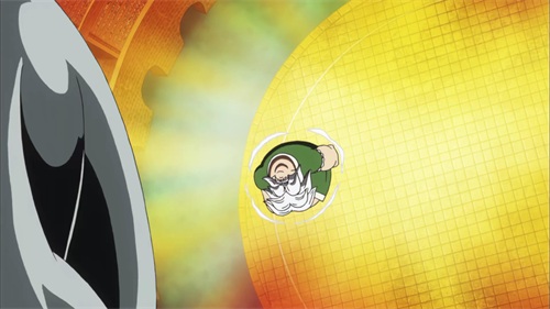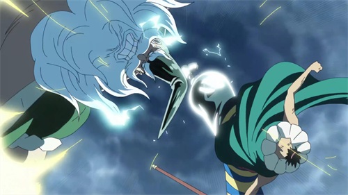 路飞在与之前与卡文迪许的交谈中不甚暴露了身份,青椒得知路飞是卡普的孙子,饮恨多年的青椒带着对卡普的愤恨向路飞出手,两人以武装色霸气展开碰撞,僵持中开启了霸王色霸气的对决,将身边的人直接清空。