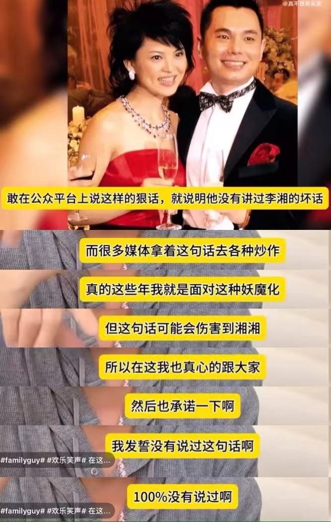 他表示自己从头到尾,无论面对媒体和身边的朋友,还有和家人,都没有说过湘湘(李湘的小名)一个不字,但就有媒体然后爆出来,说他曾经讲过,随便马路边上找一个,都会比李湘强。20多年过去了,他还是习惯称呼李湘为“湘湘”。