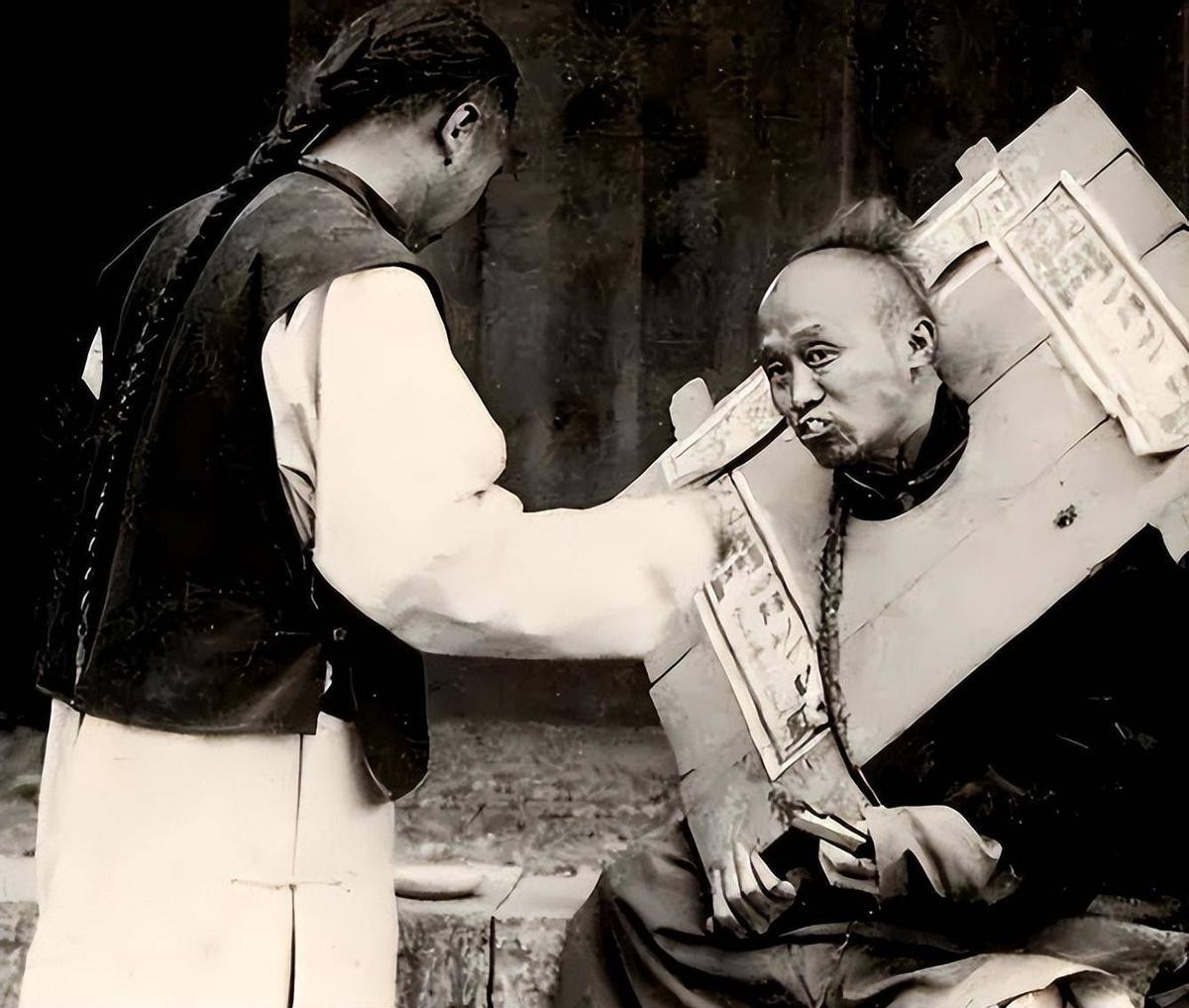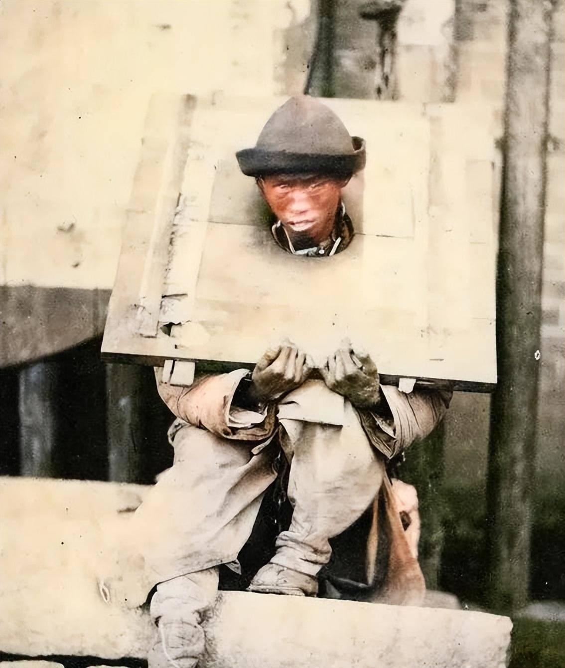 由于偷了人家的东西,他被强制戴上了枷锁进行示众