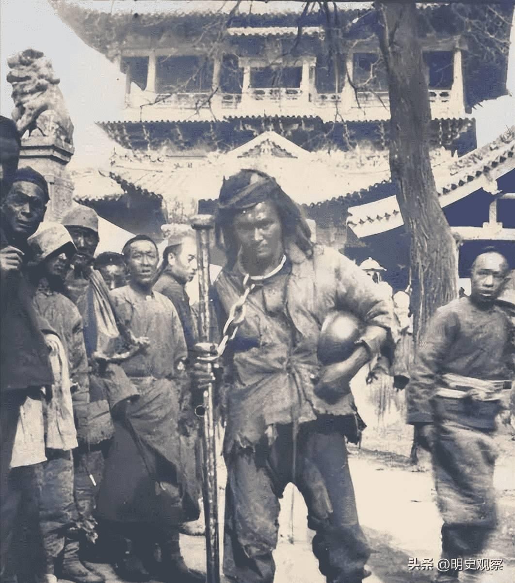 这名男子因为犯了重罪,被戴着一套看起来很是奇特的镣铐。