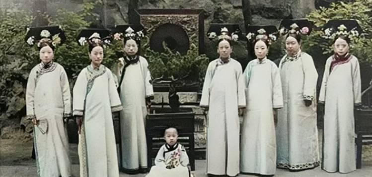 照片中是溥仪在四岁时,与庆亲王奕劻的女儿们也就是溥仪的姑姑在一起的合影